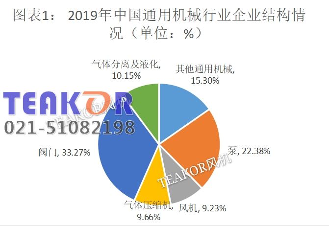 2019年,我國通用機械行業規模以上企業共計5437家,其中:泵1217家,占整體規模22.38%;風機502家,占整體規模9.23%;氣體壓縮機525家,占整體規模9.66%;閥門1809家,占整體規模33.27%;氣體分離及液化552家,占整體規模10.15%;其它通用機械832家,占整體規模15.30%。
