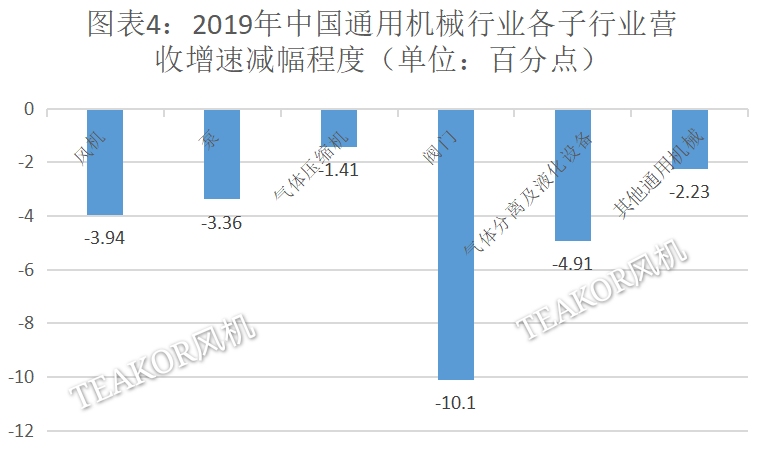 在利潤總額方面,2019年行業實現利潤總額590.14億元,同比增長6.83%,較去年同期回落8.56百分點,各分行業利潤總額增速較上年有增有降有落。泵較上年提升7.47個百分點;風機較上年提升19.12個百分點;氣體壓縮機較上年回落16.94個百分點;閥門較上年回落20.95個百分點;氣體分離及液化設備較上年回落0.57個百分點;其它通用機械回落22.41個百分點。